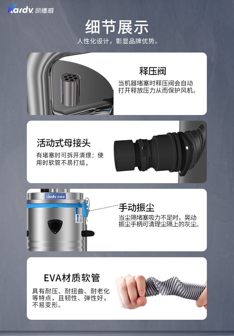 SK-510是一款工業吸塵器,整機采用工業設計風格,美觀硬朗,結構緊湊。機器集塵桶采用不銹鋼制作,桶壁光滑易清理;配有晃動振塵、泄壓閥。