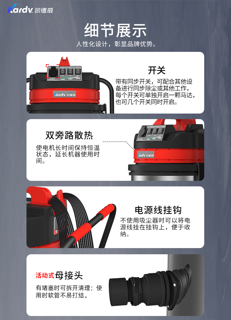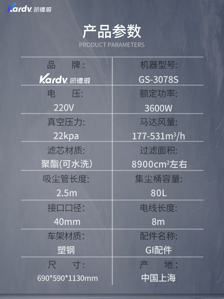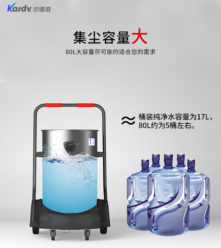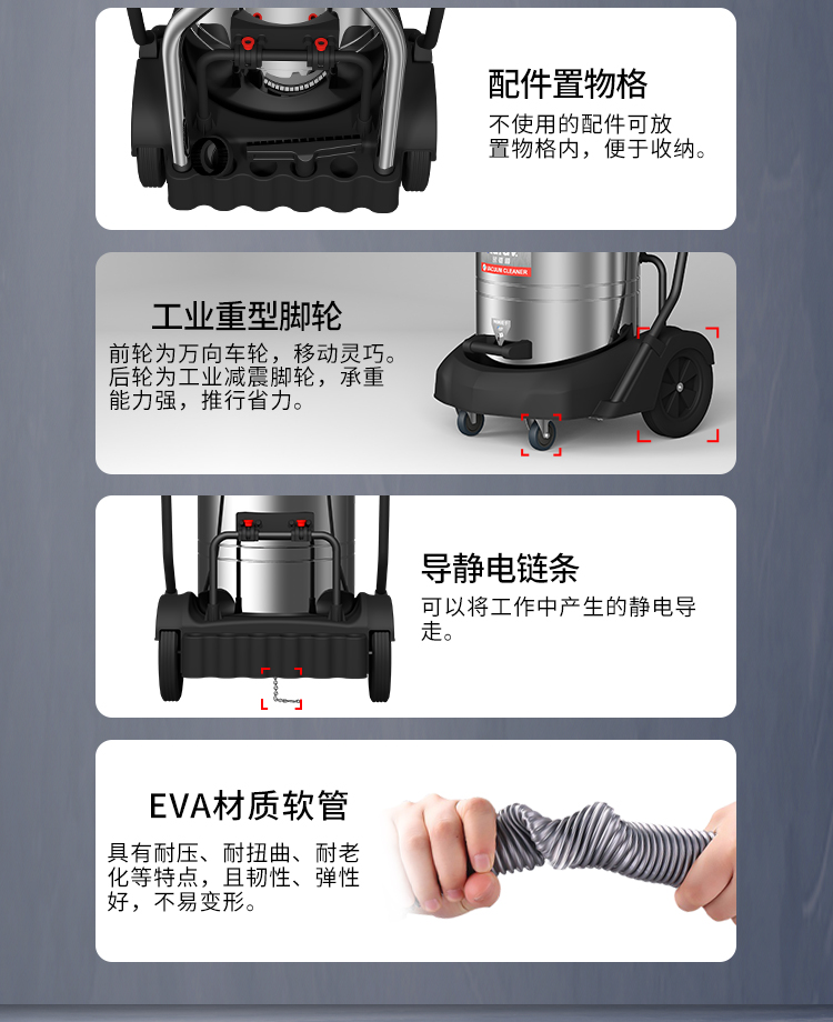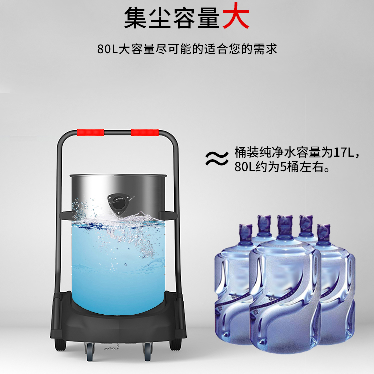 GS-3078S是一款工業型吸塵器,集塵桶為80L,為不銹鋼材質,配有車架,在移動時輕巧方便,車架底座為PP材質,底座上有置物格,可放置配件或工具方便收納和使用;可以用在工廠、倉庫或建筑工地等場所清理灰塵等,在商業環境中也可以使用。