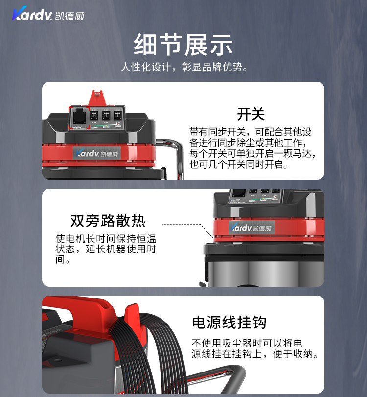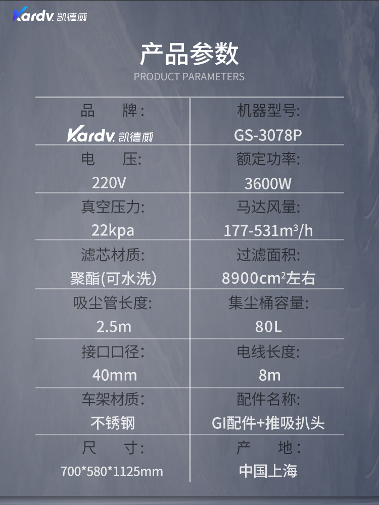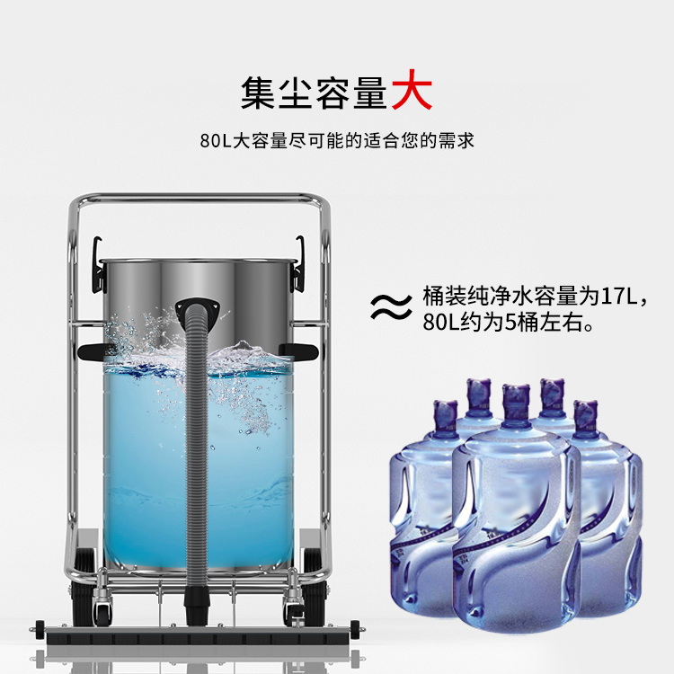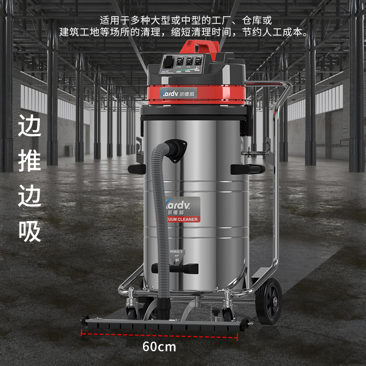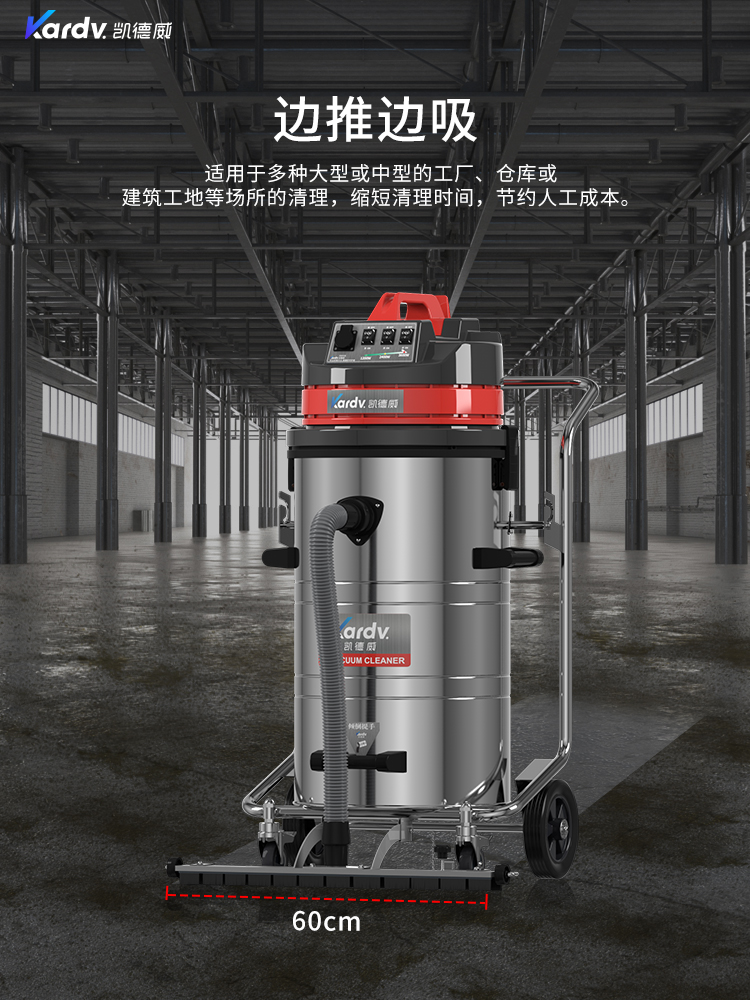 GS-3078P是一款工業(yè)型的產(chǎn)品,集塵桶為80L,為不銹鋼材質(zhì),配有不銹鋼車架,在移動(dòng)時(shí)輕巧方便;機(jī)器除常規(guī)手持式吸塵外,還裝置有60cm左右寬的推吸扒頭,可以邊推邊吸,減少了人力物力;可以用在工廠、倉(cāng)庫(kù)或建筑工地等場(chǎng)所清理灰塵等,在商業(yè)環(huán)境中也可以使用。