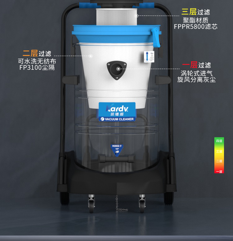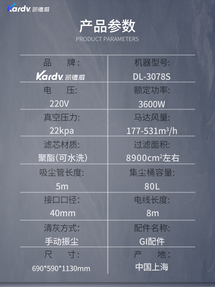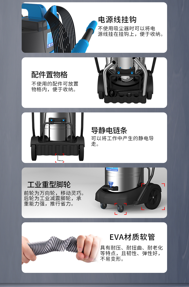 DL-3078S是一款工商業吸塵器,有3顆馬達,可單獨或聯合開啟;集塵桶為80L,為不銹鋼材質,配有車架,在移動時輕巧方便,車架底座為PP材質,底座上有置物格,可放置配件或工具方便收納和使用;配有手動晃動振塵,在使用的過程中,左右晃動振塵手柄就可以起到清理過濾器的作用;可以用在工廠、倉庫或建筑工地等場所清理灰塵等,在商業環境中也可以使用。