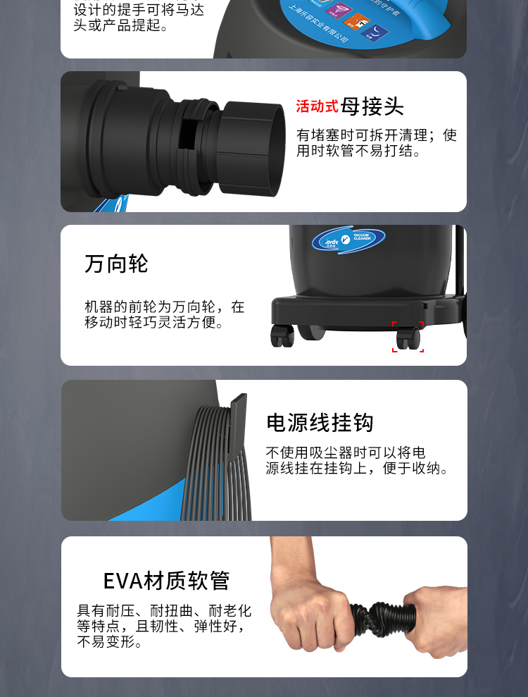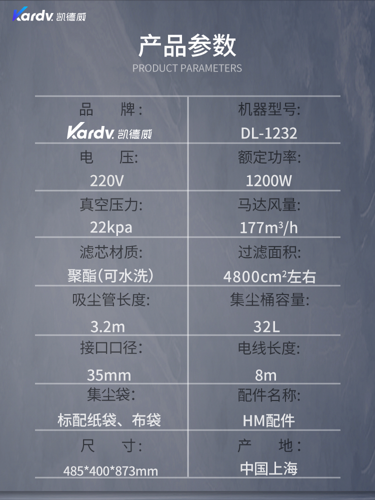 DL-1232是一款干濕兩用型吸塵器,集塵桶為32L;散熱上采用上下氣道分離設計;配有置物架,可以防止工具和配件,方便使用;可以用在倉庫、廠房等;也可與其它產品配套使用,也可用作將廢料收集;也可使用在普通的商業、企業環境,比如一般的辦公室、客房等。