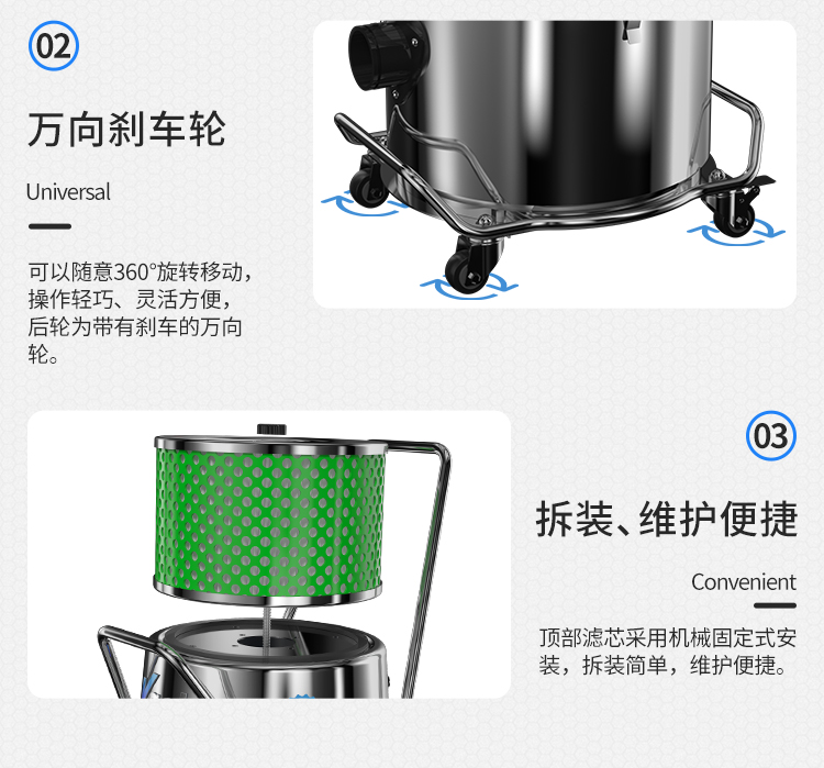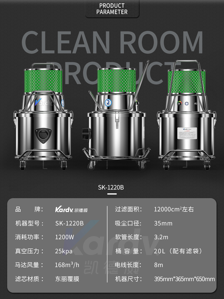 SK-1220B是由上海樂容(專利號:ZL201930663101.0)自主設計、研發、生產的一款適用于Class100潔凈車間清潔使用的吸塵器。機器采用白鋼材質,堅固耐用,外觀新穎大方。電力源采用1200W電子無刷免維護馬達并配合無級變速電控系統,吸力大小自由調節。過濾系統采用東麗覆膜濾材,總過濾面積12000cm2。主要適用于半導體、液晶、LED、精密電子器件、科研、醫藥、食品工業等各種潔凈車間。